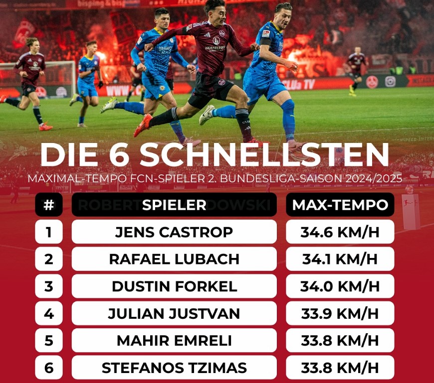 В Германии составили топ-10 футболистов, которые в сезоне 2024/25 второй Бундеслиги показали наиболее высокую скорость в составе «Нюрнберга».