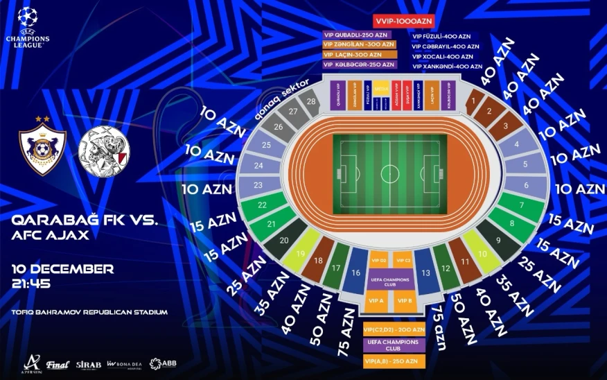 Как передает azerisport.com, стоимость билетов варьируется от 10 до 1000 манатов, в зависимости от сектора. Их можно приобрести исключительно онлайн на сайте и в приложении iTicket.az.