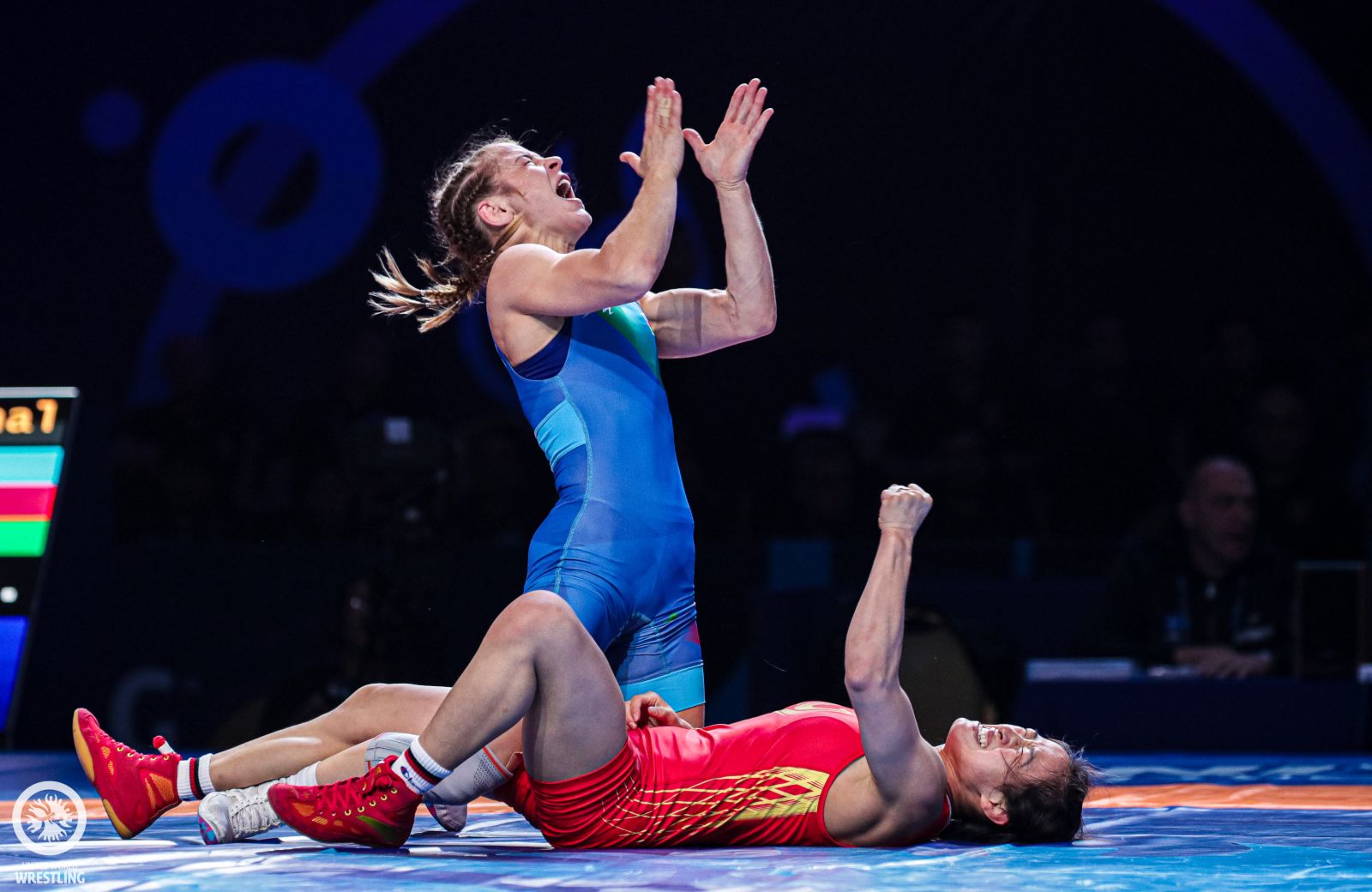 Мария Стадник празднует победу над Янань Сунь (Китай) и выходит в финал в весовой категории 50 кг.